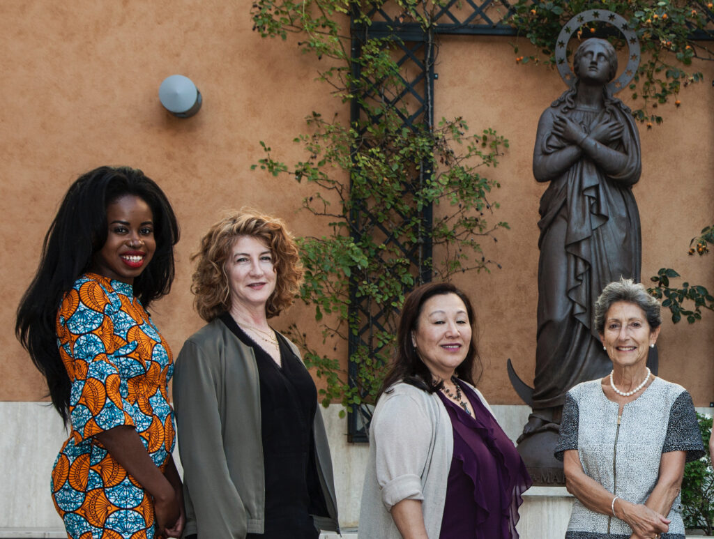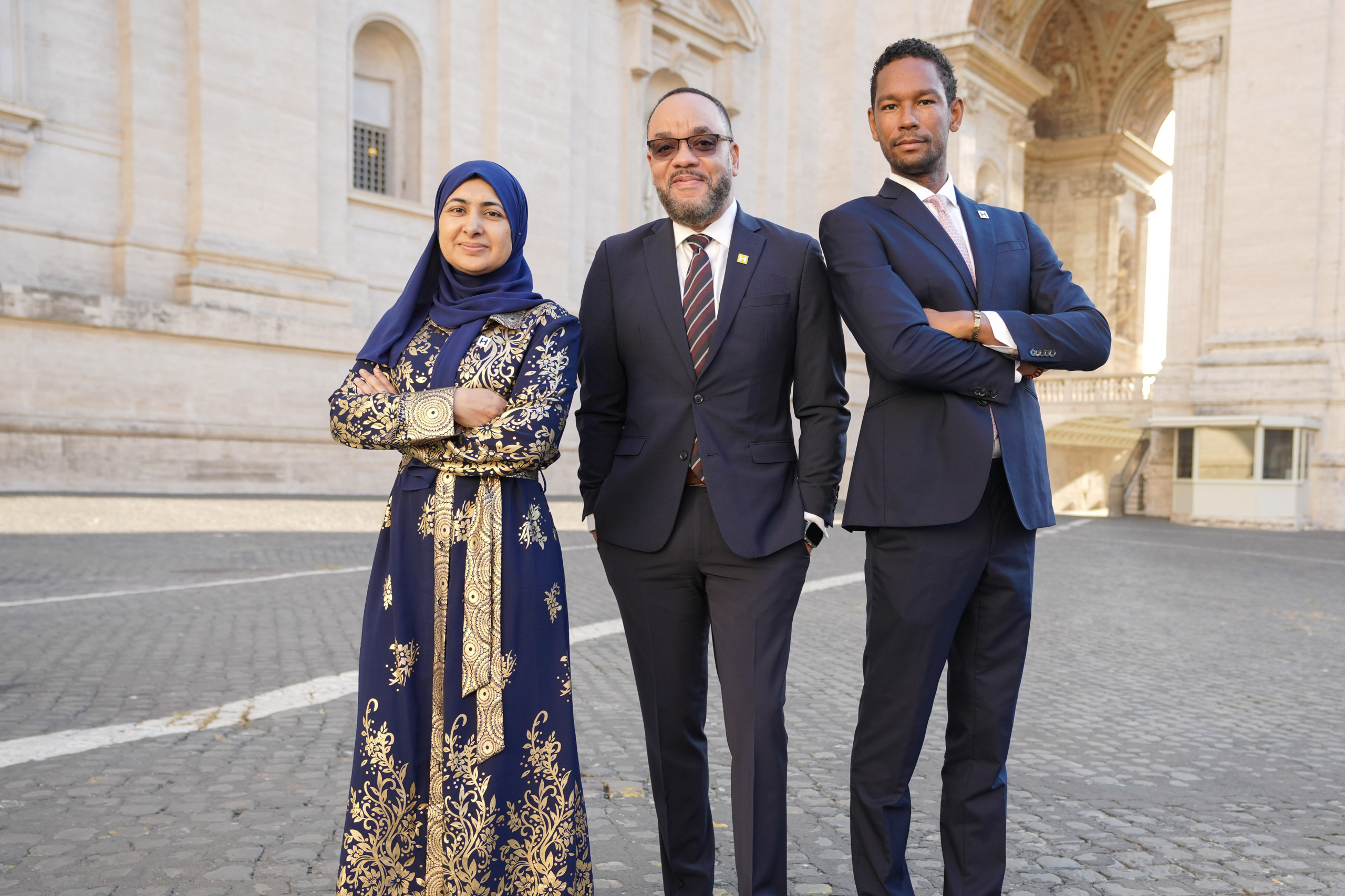 Naadiya Moosajee H’15, Brian Tippens and Mike Mompi H’20 in the Vatican Gardens